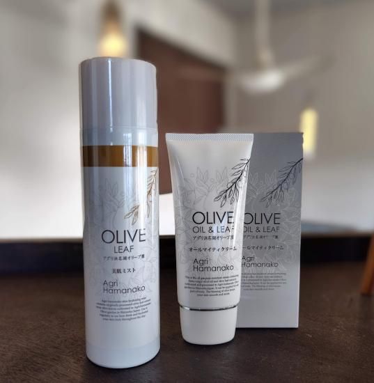 当園のオリーブから摂れた、エキストラバージンオリーブオイル&オリーブ葉エキスを贅沢に配合したマルチクリームと、オリーブ葉から抽出したエキスを配合した美肌ミストのセットです。